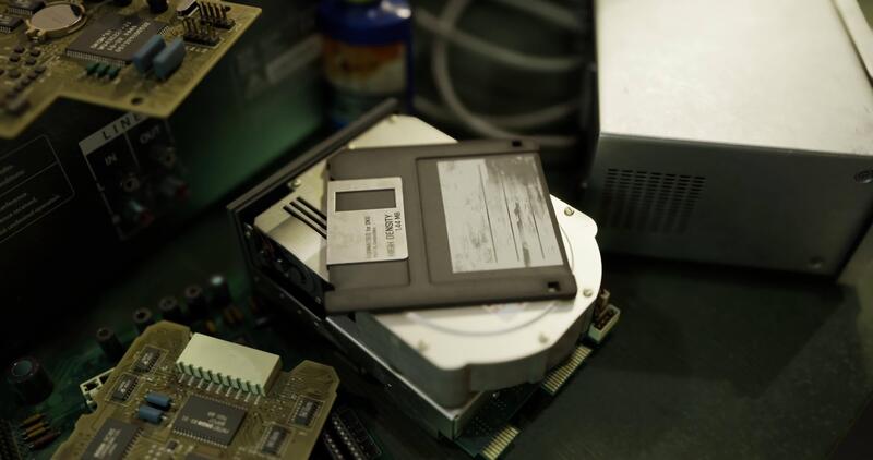 CGI Old computer hardware and floppy disk on a workbench in a workshop Pro Video