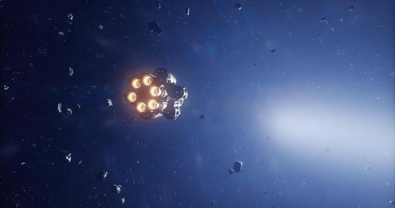 CGI Rocket ship navigating through an asteroid field in deep space Pro Video