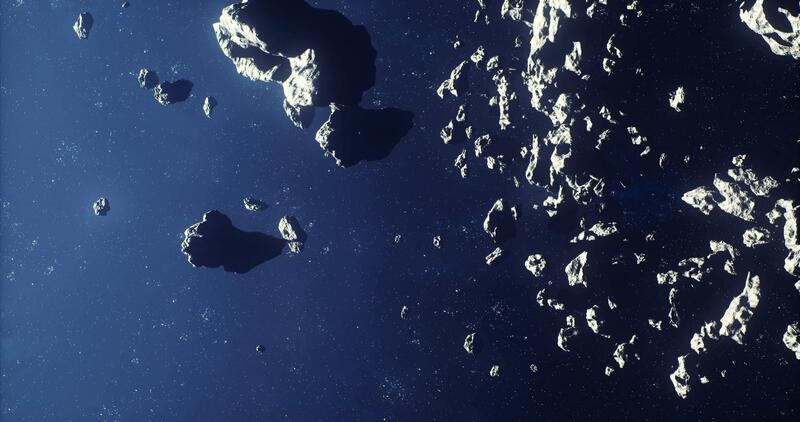 CGI Exploring a dense field of asteroids floating in deep space during twilight Pro Video