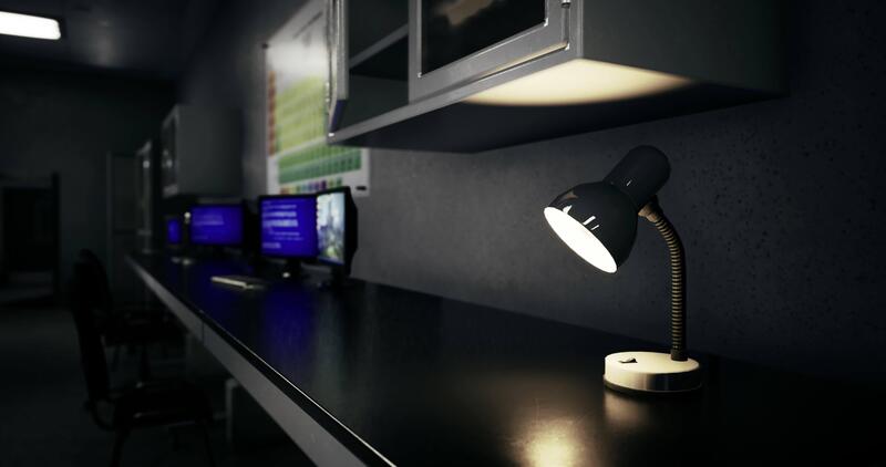 CGI Workspace with a desk lamp illuminating a dark computer lab setting Pro Video
