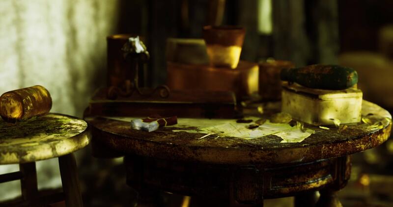 CGI Cluttered work table filled with tools and small objects in a dimly lit room Pro Video