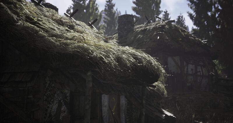 CGI Old rustic dwellings with thatched roofs in a serene forest setting Pro Video