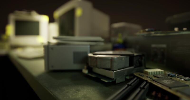 CGI Old electronics and computer parts arranged on a desk in a dim setting Pro Video