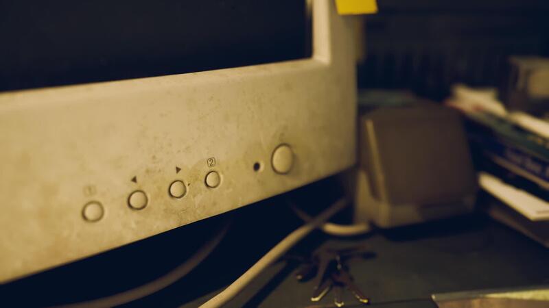 CGI Old computer monitor with buttons and dust in a cluttered workspace Pro Video