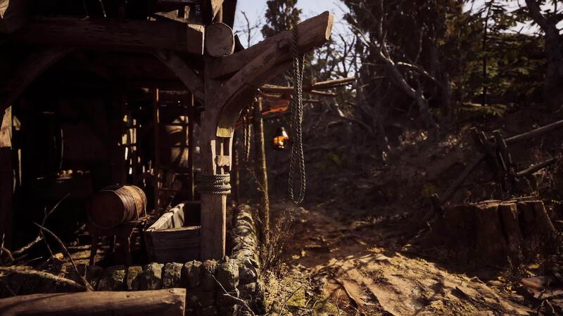 CGI Rustic wooden structure in a moody forest setting during daylight hours Pro Video
