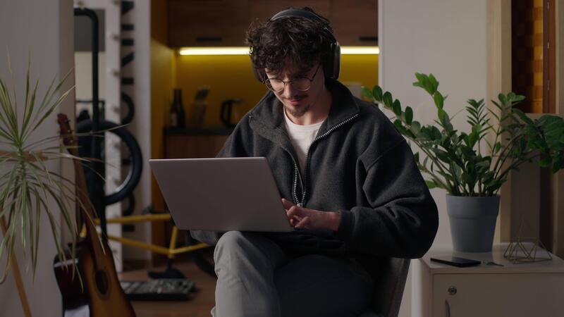 Glad Hispanic guy worker using laptop at home man freelancer typing computer programmer work remote job developer browse web male in headphones playing virtual game online hipster shopping on Internet Pro Video