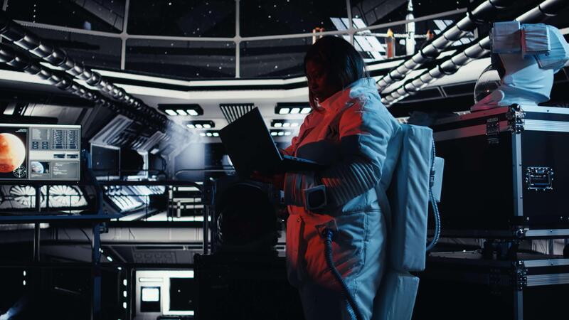 Astronaut blinded by light coming from alien vessel while navigating orbital trajectory. Cosmonaut exploring planetary surfaces making contact with extraterrestrial presence, camera A Pro Video