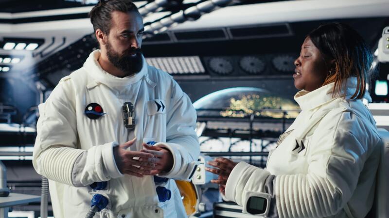 Astronauts discussing last details stepping out for scheduled operations outside starship exploring deep space. Cosmonauts chatting, preparing for mission launch after landing on planet, camera B Pro Video