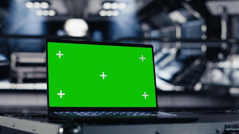 Green screen laptop inside futuristic spacecraft bay next to nearby monitor displaying Mars dashboard system telemetry. Mockup notebook used for navigation to red planet during orbital mission Pro Video