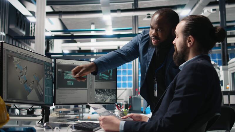 Team of diverse engineers partners evaluating solar performance in high tech industrial factory, focusing on sustainable energy development. Alternative power for modern operations. Camera B. Pro Video