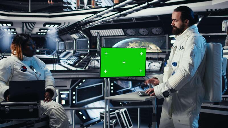 Astronaut monitoring system diagnostics on green screen display, talking to colleague during space mission. Teamworking cosmonauts using chroma key monitor during mankind survival expedition, camera A Pro Video