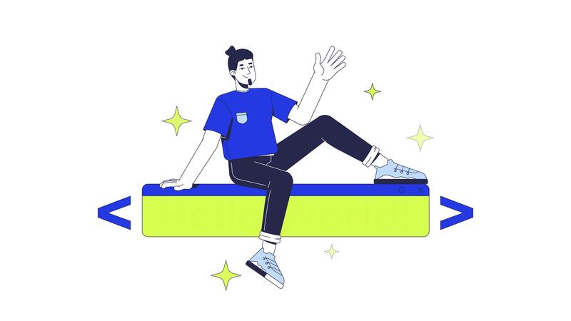 Developer over hello world text banner 2D animation. IT school courses. Joyful coder introduces beginner to programming animated character cartoon flat concept metaphor 4K isolated on white Pro Video