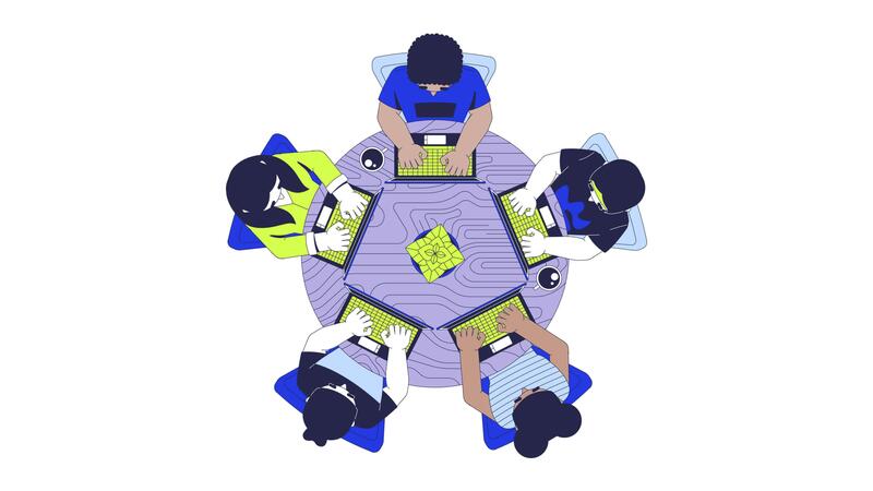 Hackathon programming group top view cartoon animation. IT school. Coding class. Code team. Diverse developers laptops around round table animated flat 2D characters 4K isolated on white Pro Video