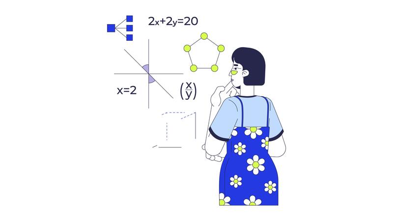 Learning mathematics for programming 2D animation. Asian female math student studying equations geometry in STEM coding animated character cartoon flat concept metaphor 4K isolated on white Pro Video