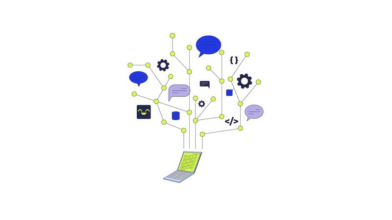 Laptop generating communication and coding tree structure 2D animation. Programming, web development, IT speech bubbles animated object cartoon flat concept metaphor 4K isolated on white Pro Video