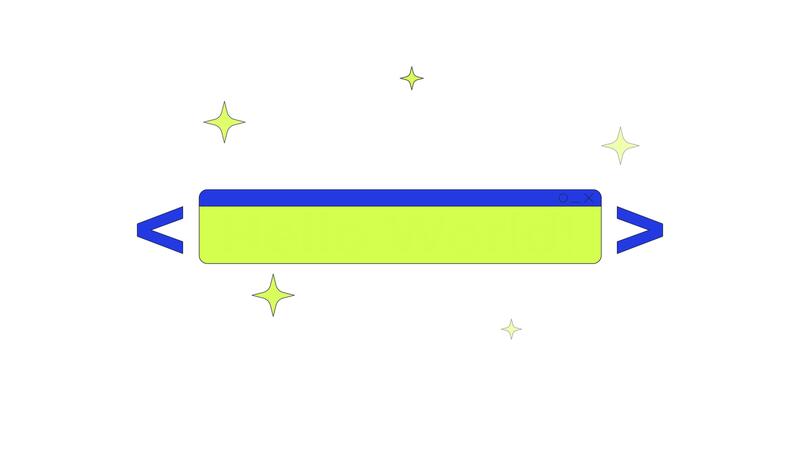 Hello world text coding banner in sparkles and code brackets 2D animation. Iconic starting point in programming phrase animated object cartoon flat concept metaphor 4K isolated on white Pro Video