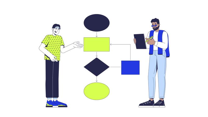 Learning data structures and algorithms 2D animation. IT school. Teacher explaining flowchart in programming to student animated characters cartoon flat concept metaphor 4K isolated on white Pro Video