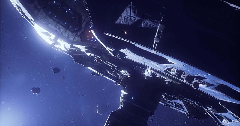CGI Space station navigating through an asteroid field in deep space environment Pro Video