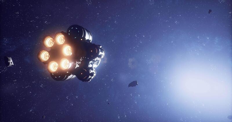 CGI Spaceship navigating through asteroid belt in deep space Pro Video