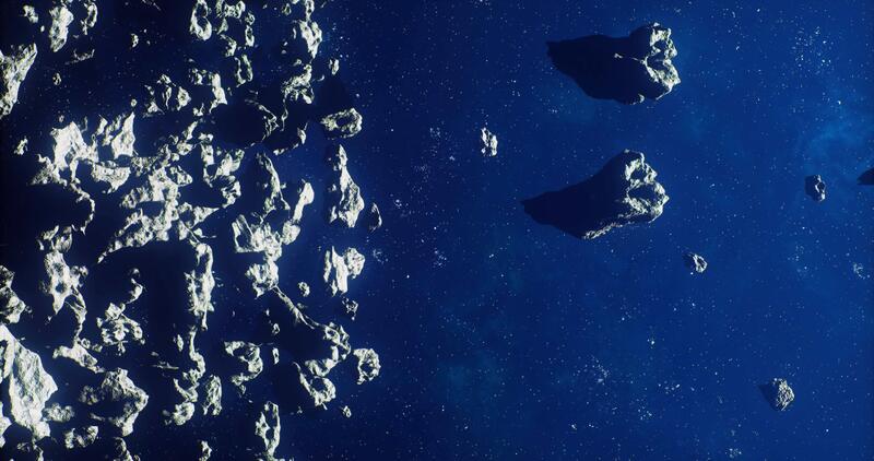 CGI Exploring a vast field of asteroids in deep space away from celestial bodies Pro Video