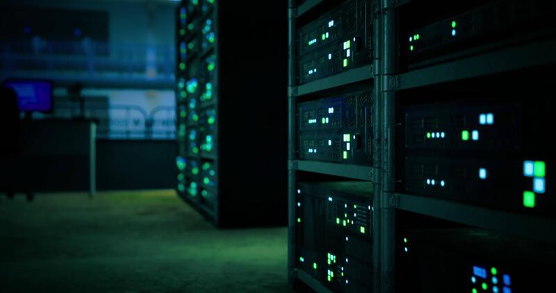 CGI Illuminated server racks in a dark data center during late night hours Pro Video
