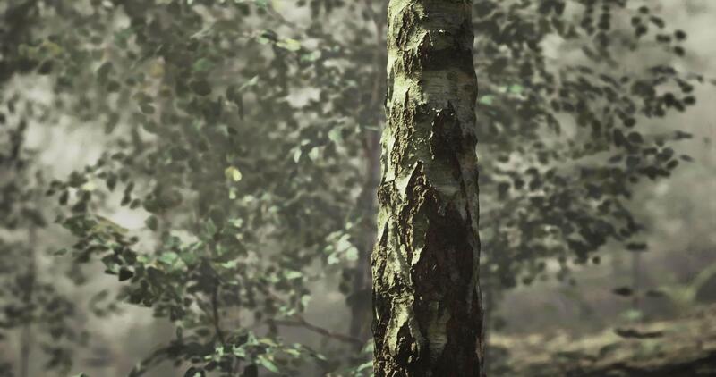 CGI Nature setting with tree trunk and lush greenery in tranquil surroundings Pro Video