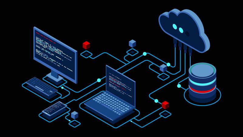 Cloud technology computing animation. Modern cloud technology. Data center isometric concept. Isometric cloud technology with datacenter. Web hosting concept. Transparent background Pro Video
