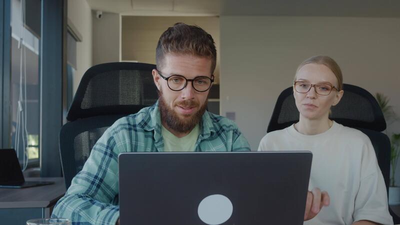 Two sales representative are collaborating on project, sharing ideas and working together on laptop in modern office environment, engaging in productive teamwork and problem solving Pro Video