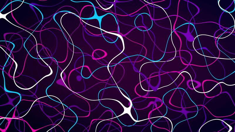 Magenta, cyan, purple and white lines moving randomly, forming circles against a dark violet background. Loop sequence. 3D Animation Pro Video