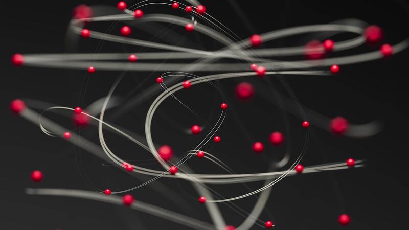 Abstract animation with moving shiny lines connecting red spheres. The blur effect and dynamic movement create a sense of depth, making it perfect for scientific and technological projects. Pro Video