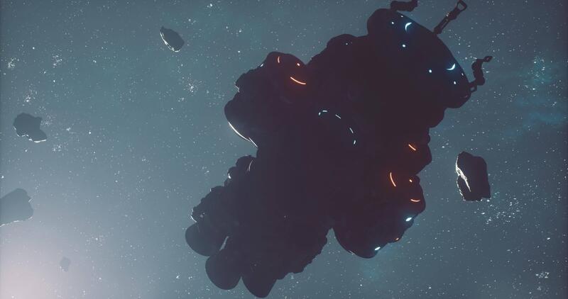 Surreal CGI Spaceship navigating through asteroid field in deep space near distant star Pro Video