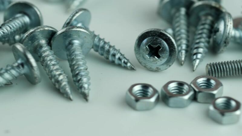 Close-up of various metal screws and nuts on a white surface. The screws have sharp threads and a star-shaped head. The nuts are hexagonal and shiny. Pro Video