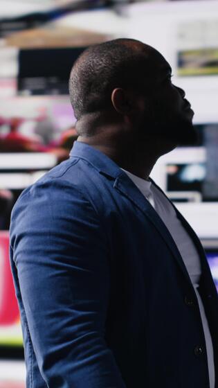 Vertical African American professional browses high tech environment with app icons, infographics and social networking feeds. Showcases big data on social media platforms, digital influence. Camera B. Pro Video