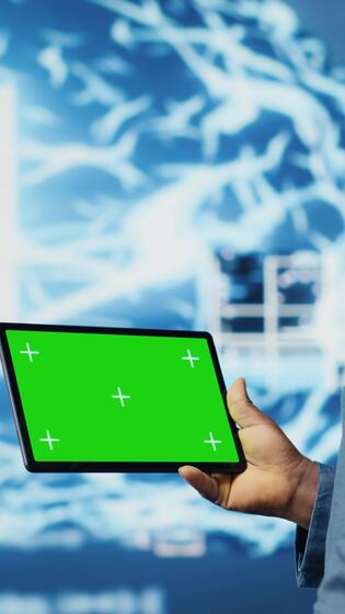 Vertical Modern black person in digital space uses isolated display with AI tools, representing artificial intelligence data structures and intelligent systems. Innovation and cybernetics for science. Camera B. Pro Video