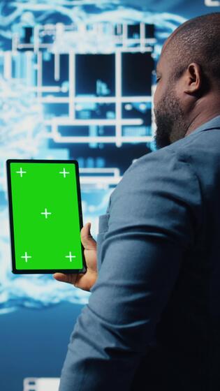 Vertical African american expert holds tablet with isolated screen next to cloud computing systems, focused on AI brain development and machine learning for innovation. Smart tech data science. Camera A. Pro Video