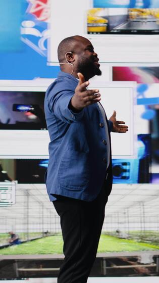 Vertical Confident black public speaker delivers guidance at a live event, presenting digital influence and e commerce at the convention. Social media feeds for web communication. Entertainment. Camera A. Pro Video