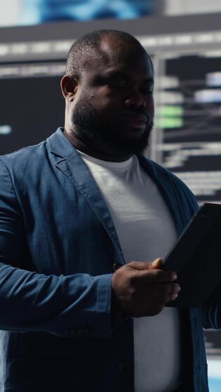 Vertical African American developer working on programming and automation, coding on a laptop with a futuristic interface behind him. Tech professional thrives in a world of AI and code snippets. Camera B. Pro Video