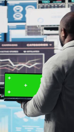 Vertical Black executive manager studying copy space screen with data insight for business growth, surrounded by virtual graphs and forecasting models. Financial performance and decision making. Camera A. Pro Video