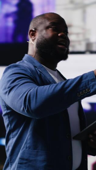 Vertical Black presenter hosting conference on stage surrounded by media visuals, symbolizing global convention with live audience to discuss about online trends and mobile apps. Public event. Camera B. Pro Video