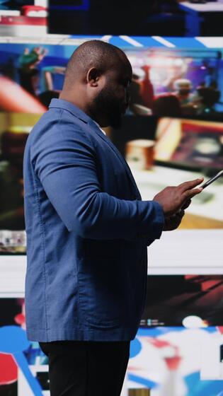 Vertical Young black person connecting to global social networks apps through mobile devices, opening platforms online on the dashboard. Communication and multitasking on social media. Camera A. Pro Video