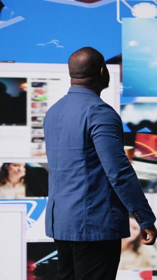 Vertical African American professional browses high tech environment with app icons, infographics and social networking feeds. Showcases big data on social media platforms, digital influence. Camera A. Pro Video