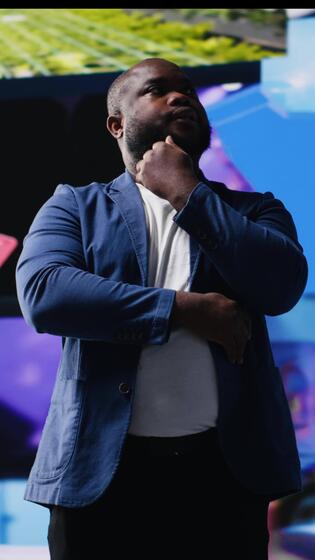Vertical African American digital creator using dashboards with dynamic screens showcasing social media and networking, highlighting the importance of online engagement and global connection. Camera B. Pro Video