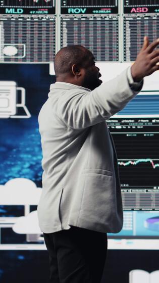 Vertical Black entrepreneur thinking about a new projection to increase revenue, evaluating infographics and financial reports with digital tech tools and analytics. Success and development. Camera A. Pro Video