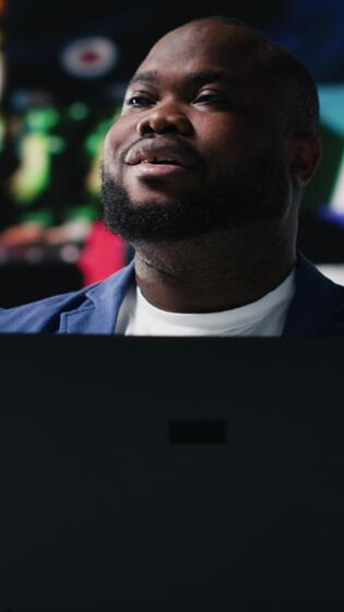 Vertical African american specialist engaging with media dashboards screens, emphasizes networking with AI and technology. Tech driven guy showcases online platforms and internet communication. Camera B. Pro Video
