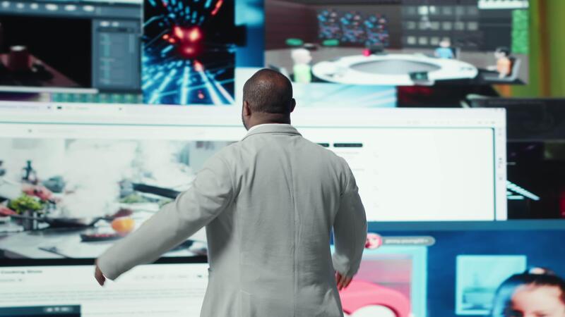 Ecstatic viewer celebrating freedom of unlimited content in virtual space. Delighted african american man with open arms in front of videowall enjoying multiple broadcasting channels, camera A Pro Video