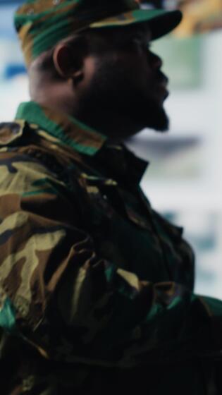 Vertical Military officer reviewing data from surveillance and works on tactical operations, tech driven mission control hub. Soldier uses threat detection electronic systems for national interests. Camera B. Pro Video