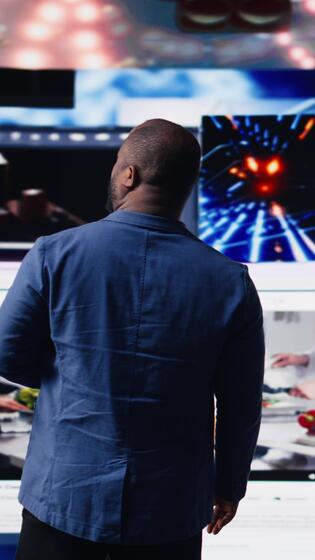 Vertical African american person connected in a world of platforms and digital content, future of social engagement, AI driven networks and interactive web experiences. User interface. Camera A. Pro Video