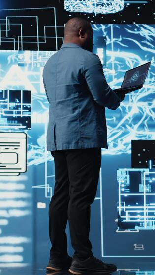 Vertical African american tech expert works with AI ethics and neural networks, virtual intelligence brain tools for machine learning systems. Algorithmic thinking development on dashboard. Camera A. Pro Video