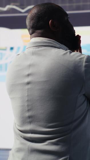 Vertical African american guy reflecting on annual financial reports for new development, reviewing the complexity of performance analysis with a focus on productivity and forecasting, AI tools. Camera B. Pro Video