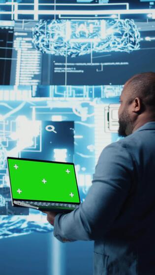 Vertical Modern black person in digital space uses isolated display with AI tools, representing artificial intelligence data structures and intelligent systems. Innovation and cybernetics for science. Camera A. Pro Video